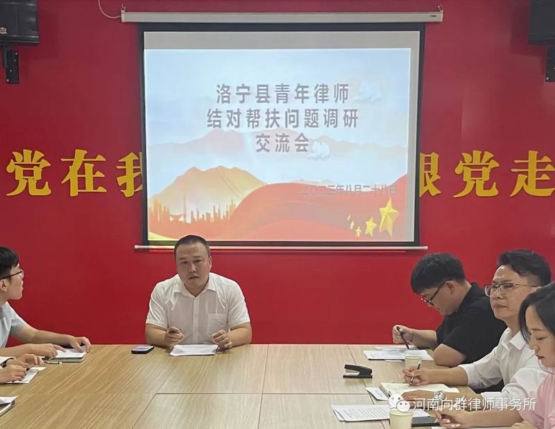 2023年8月28日,洛宁县青年律师结对帮扶问题调研交流会在河南向群律师事务所会议室召开,洛宁县域河南向群律师事务所、河南齐合律师事务所、河南卓青律师事务所近二十名青年律师参与了本次会议,本次交流会由河南向群律师事务所青年党员律师郭陶利主持。